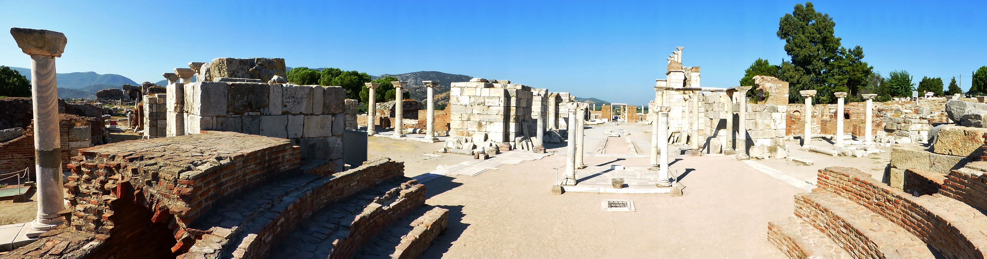 Ruins of the basilica of St. John, on the slopes of Ayasuluk Hill, constructed by Justinian I in the 6th century. Modelled after the now lost Church of the Holy Apostles in Constantinople, it stands over the believed burial site of John the Apostle. 31 August 2015.