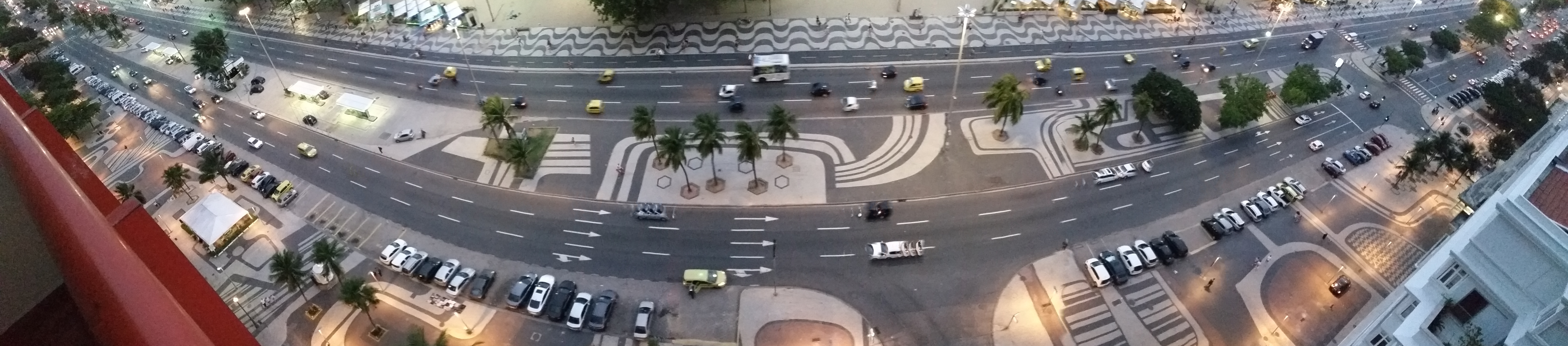 The Copacabana promenade, Avenida Atlântica, is a pavement landscape in large scale (4 km long). It was rebuilt in 1970 and has used a black and white Portuguese pavement design since its origin in the 1930s: a geometric wave. The promenade was designed by Roberto Burle Marx. Rio de Janeiro, 4 October 2018.