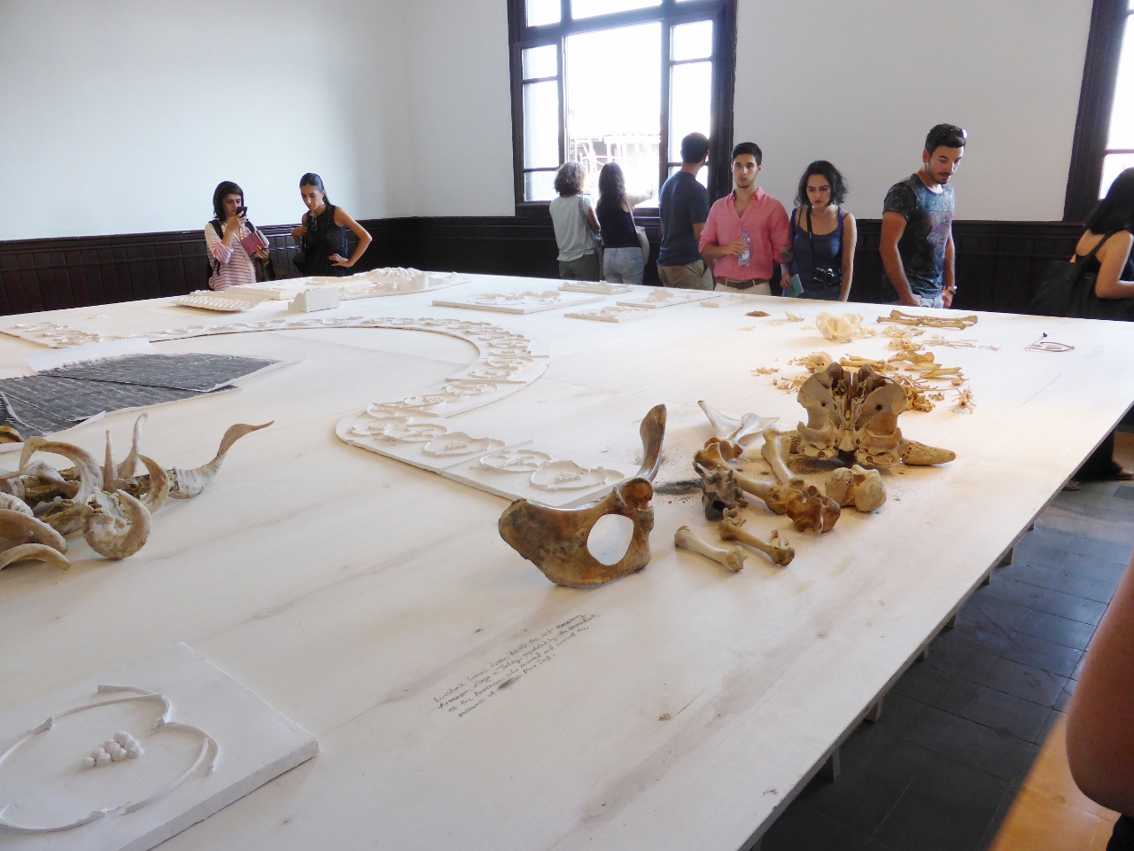 At other venues around Istanbul several artists, either of Armenian heritage, or exploring ideas about Armenian issues, were easy to find. On the ground floor of the neoclassical Galata Greek Primary School in the old European quarter of Beyoğlu, was Anna Boghiguian’s (born Cairo, lives in various countries) large-scale installation The Salt Traders 2015, made of disparate materials including textiles, wax, gouache, salts and sea sounds. On the top floor Michael Rakowitz (lives and works in Chicago) brought together several Armenian ghosts in The Flesh is Yours, The Bones Are Ours 2015, a moving installation combining plaster moulds, casts, dog skeletons from Sivriada (one of the Princes’ Islands where stray dogs from Istanbul were exiled in the early 20th Century) and bones of livestock from dispossessed Armenian farms in Anatolia.