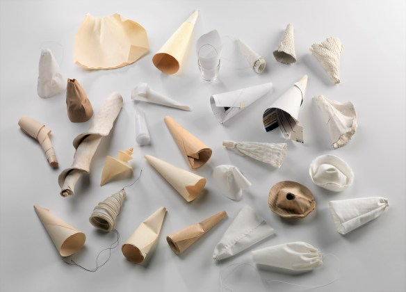 ‘WOOD: art design architecture’, Catherine Truman, Some uncertain facts: spiral, cone, funnel, 2012. Installation of objects: paper, card, wax, clay, plastic conduit, shell, cotton cloth, hand-carved English lime wood, 15 x 70 x 90cm. Photo: Grant Hancock