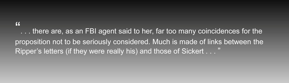 Questions remain: if the London Metropolitan Police at the time had been able to deduce the clues more succinctly — the Ripper left many cryptic and taunting messages it seems — and as a consequence had Sickert become a suspect, would he have been charged? Would a jury today convict on the evidence presented in this book (assuming the DNA process remained inconclusive)? I think not, but these issues aren’t really addressed by Cornwell. This is only the case for the prosecution. For some strong rebuttals to her theories, check out the substantial Ripper website www.casebook.org which suggests that Cornwell’s book is based almost entirely on pure speculation. ‘. . . certain ideas about the Ripper crimes are, unfortunately, largely inaccurate’.