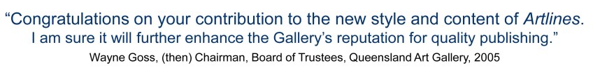 W Published January 28, 2013 at 2982 × 369 in Artlines magazine “We had a champion at DFAT in Neil Manton and, at the [Australia] Council, in Ian Were. They in turn got support from their superiors. We owe a lot for their trust in our promises of what we could do.” Like Loading...