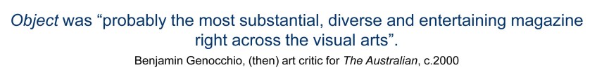 W Published January 28, 2013 at 2982 × 390 in Object magazine “We had a champion at DFAT in Neil Manton and, at the [Australia] Council, in Ian Were. They in turn got support from their superiors. We owe a lot for their trust in our promises of what we could do.” Like Loading...